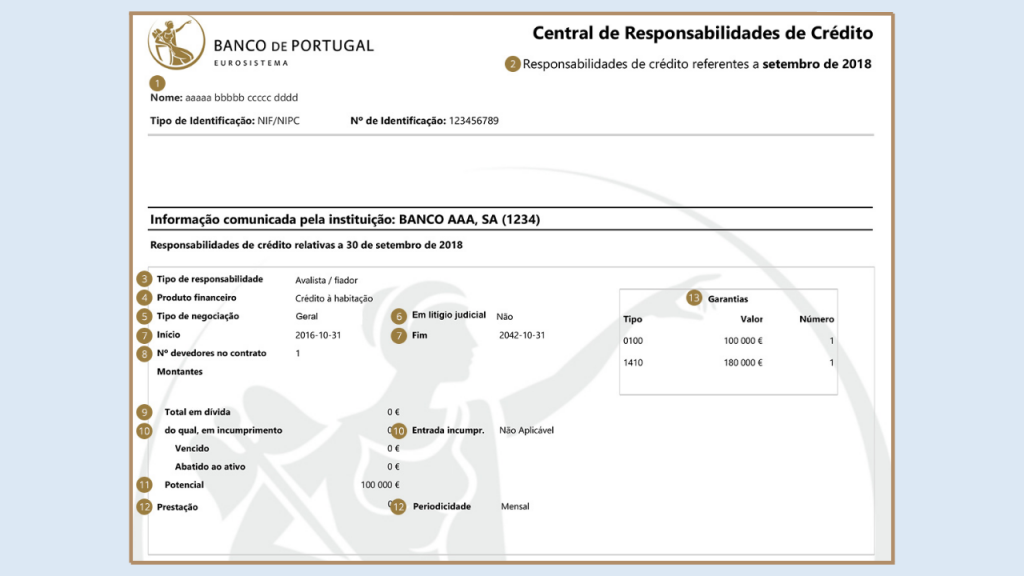 Este documento recebe informação dada mensalmente pelas instituições financeiras de crédito, que comunicam ao Banco de Portugal os montantes em dívida, os valores em atraso (caso existam) e as prestações mensais.